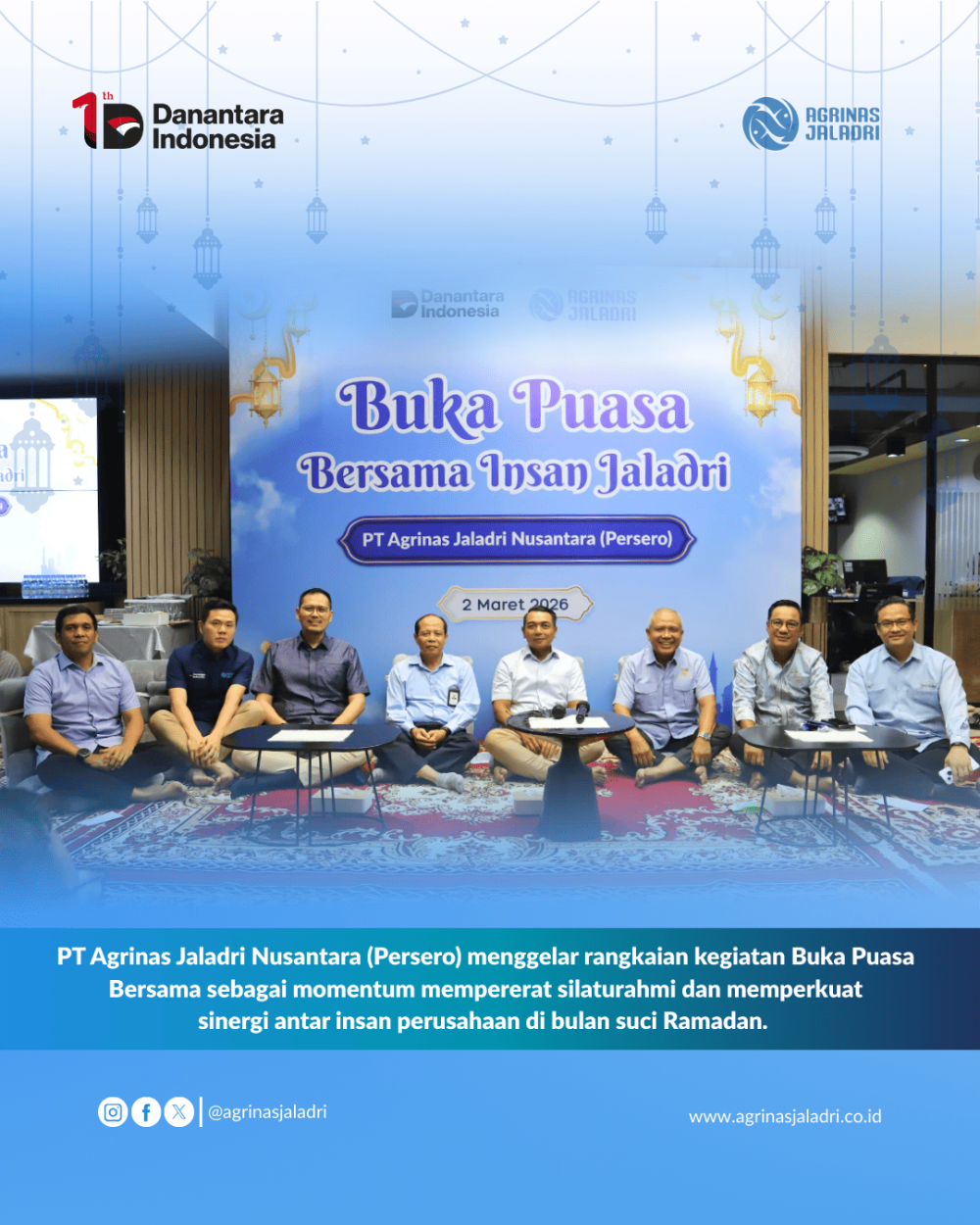 Jakarta, 2 Maret 2026 — PT Agrinas Jaladri Nusantara (Persero) menyelenggarakan kegiatan Buka Puasa Bersama yang dihadiri oleh seluruh Insan Jaladri sebagai momentum mempererat silaturahmi dan memperkuat kebersamaan di bulan suci Ramadan.
